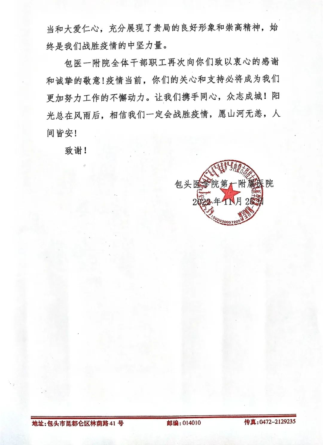 一封感谢信是一份肯定,更是一份动力。市医疗365bet赌城_365体育app手机版下载_365bet博彩官网将坚持人民至上、生命至上,以高度的政治责任感和使命感,积极履职、主动担责,在“爱包头、作贡献”的实践中彰显包头医保人的责任与担当,切实将党的二十大精神贯彻落实到医疗保障工作的全过程、各方面。