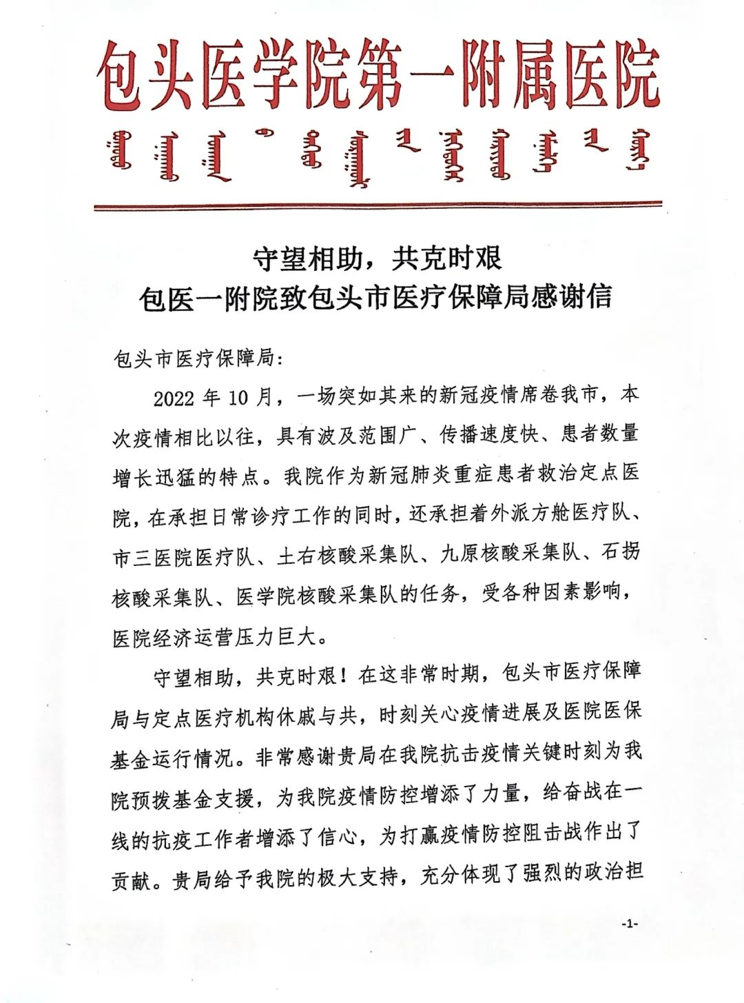 近日,包头市医疗365bet赌城_365体育app手机版下载_365bet博彩官网收到来自包头医学院第一附属医院的感谢信,对我局在疫情期间为重点医疗机构及时预拨医保基金、助力医院渡过难关表示感谢。